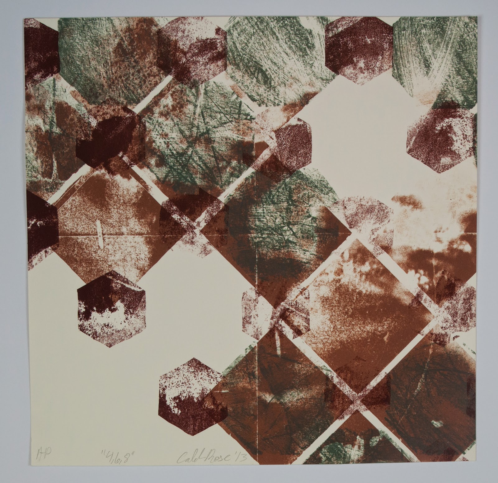 Caleb Rose transferred from Angelina College to finish his degree at SFA. In May, 2014, Caleb graduated with a BA in Art, emphasizing in printmaking. While at SFA, Caleb specialized in lithography, screen printing, and alternative photographic processes, including pinhole photography. Caleb used a blend of geometric abstraction and layered texture as a foundational aesthetic approach to most of his work.
